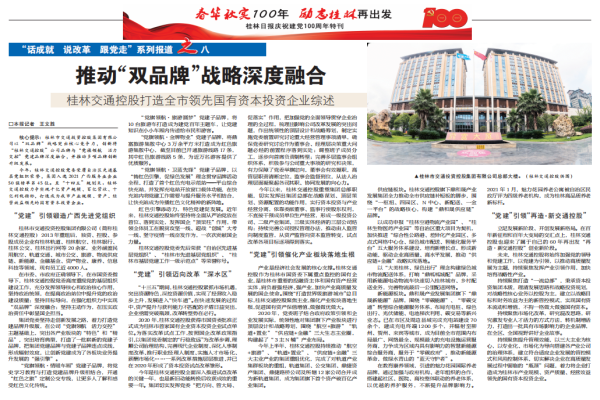 核心提示:桂林市交通投资控股集团有限公司以“双品牌”战略突出核心竞争力,创新将“桂林交通控股”公司品牌与“党旗领航 活力交控”党建品牌深度融合,并推动多项品牌创新升级发展。 今年,桂林交通...