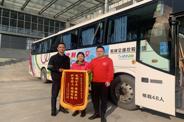 12月23日,桂林理工大学老师代表该校全体师生将一面印有“定制公交 便捷出行 护学路上 感谢有您”的锦旗送至公交集团,对定制公交工作人员为学生考试保驾护航表示感谢。12月18日是2021年全国大学英语四六...