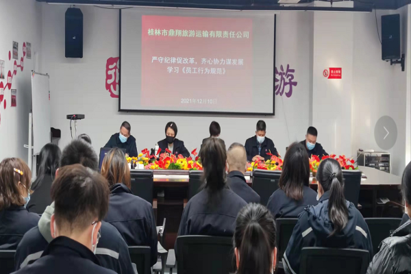 12月10日,鼎翔旅游召开全体管理人员会议,组织员工认真学习《员工行为规范》及相关文件,加强企业管理、加强制度建设。会议提出,目前企业正处于国企改革三年行动的关键期,公司管理人员要以完善现代企业...