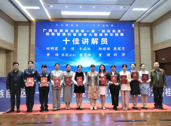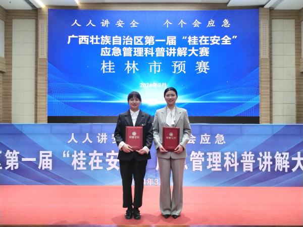 经过集团公司内部评选和市国资委推荐,集团公司下属鼎晟能源公司田明霞、机场路公司刘莎参加自治区第一届“桂在安全”应急管理科普讲解大赛桂林市预赛,并从全市21名参赛选手中脱颖而出,均获得“十佳讲解员”称号。