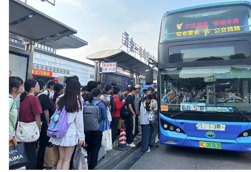 ▲国庆期间大量市民、学生乘坐公交车出行