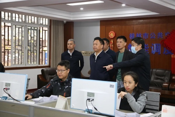 在桂林公交铁西车场,蒋平华一行现场查看了公交车运营情况,参观了公交公司智能调度中心,通过大屏幕现场观看了智能系统实时监控、智能调度等主要功能,并听取了桂林公交负责人对公交运营情况、节前安全工作开展情况的汇报。