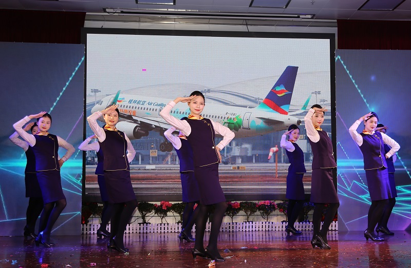 表彰结束后,“向新而行”企业年会拉开序幕。集团总部、轨道集团、鼎晟能源集团、鼎捷资产集团、桂林航空等12支参演队用嘹亮的歌声、优美的舞姿、欢乐的情景剧,演绎出了喜庆欢乐的节日氛围和国企人坚守岗位、“干”字当头的精神风貌,给观众带来一场视觉和听觉的盛宴。