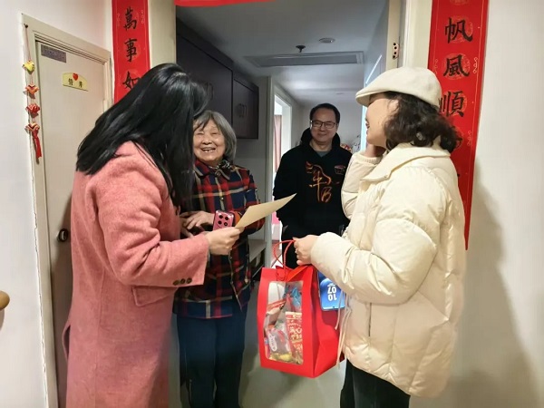大年初一一早,公寓管理团队开启一对一入户慰问,送上新春福袋、定制年货与专属荣誉证书。证书依长者爱好与日常表现定制,“歌唱达人”“从容生活家” 等称号尽显用心,工作人员还细致询问长者身体、生活与节日需求,耐心倾听并及时记录回应,这份专属关怀让长者倍感温暖与自豪。
