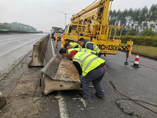 接到巡段员的险情报告后,机场路公司立即启动应急处置预案,第一时间调度应急养护队伍,备齐专业作业工具与安全警示设备,同步调配吊车紧急赶赴事故现场。作业过程中,全体人员严格遵守安全操作规范,采取人工与吊车配合作业的方式,分工明确、联动高效,迅速完成路面碎片清理、受损隔离墩复位及加固工作,仅用最短时间就彻底消除道路安全隐患,让世纪立交桥恢复正常通行秩序,为过往群众打通了安全出行的通道。