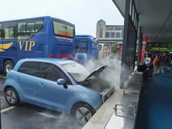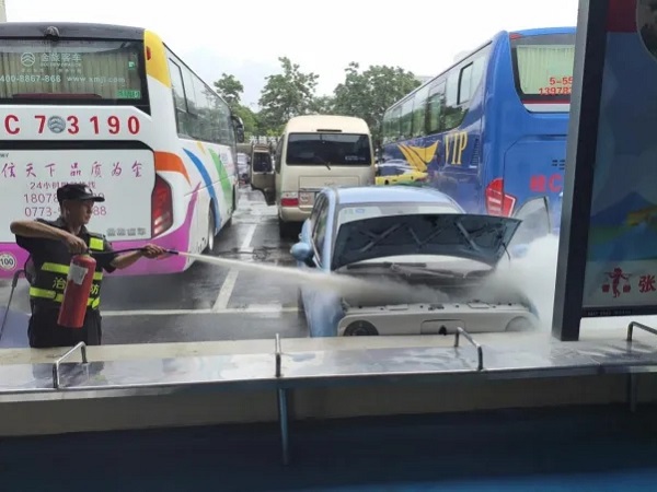 近日,桂林北站东广场1号停车场突发一起车辆起火事故。一辆私家车在入库时,驾驶员因操作失误误将油门当作刹车,车辆失控撞向广场南侧连廊墙基,引擎舱随即起火并冒出浓烟,现场情况危急。