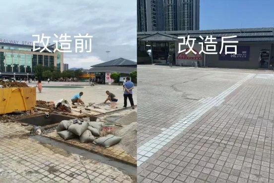 聚焦旅客实际需求,广场近期完成多项“微改造”:解决历史遗留的污水排放问题,更换破旧广告牌20余块,新增约150米隔离护栏与6处安全防护设施;修补破损地面200余平方米,连廊区域更换50张休息座椅;升级后的高清监控系统实现无死角覆盖,16幅展现桂林山水与文化的公益广告在南北连廊亮相,成为展示城市魅力的“流动风景线”。