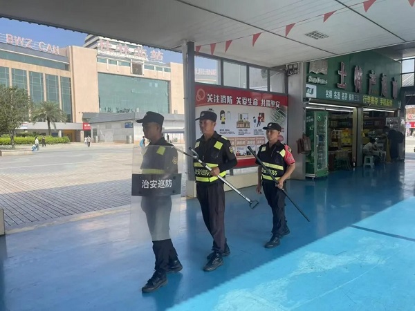 以秩序严管,保障旅客顺畅出行。建立“安保—警务1分钟联动机制”,每日投入18名保安人员实施24小时不间断巡逻,重点覆盖进站口、出站口、出租车候客区,形成“白天见保安、夜间见警灯”的立体化防控体系。