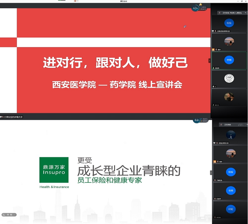 为切实做好2021届毕业生就业工作,贯彻落实“就业促进周”工作要求,考虑学生分散实习实际,5月19日晚,药学院邀请西安天博医学检验所、鼎源万家公司两家医药企业进行线上专场宣讲招聘会。药学院党总支副书记王黎、校企办主任闫平、天博检验经理张洁、鼎源万家主管暨我校优秀校友全海婷及2021届未就业学生参加了会议。会议由校企合作办焦姣主持。