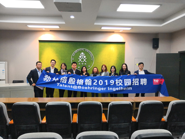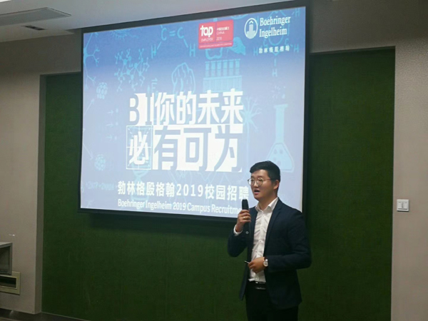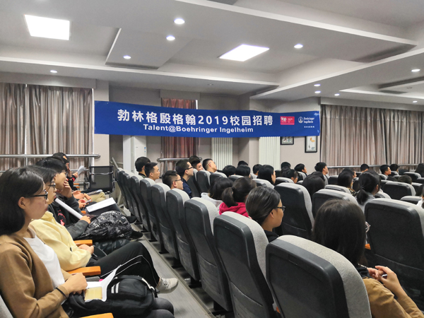 2018年10月20日下午,勃林格殷格翰公司(BI)在我校药学院三楼报告厅举行2019届毕业生校园招聘会。勃林格殷格翰公司成立于1885年,总部位于德国殷格翰,是一家致力于人类生物制药化学和动物健康产品的医药公司,连续五年蝉联“中国杰出雇主”认证。