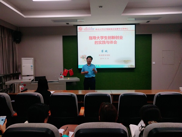 紧接着,崔斌教授展示了一部关于西北大学化学与材料科学学院的VCR并由此引出本次会议主题——创新创业。他介绍了自己的研究课题,提到了将研究课题与创新创业相结合的方法。基于此,崔斌教授讲述了在创新创业项目中需要将移动互联网、云计算、大数据、人工智能、物联网等新一代信息技术与经济社会各领域紧密结合,鼓励师生充分发掘专业优势,创新网络化服务模式,促进互联网与教育、医疗、交通、金融、消费等深度融合。