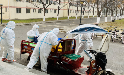 魏丰老师到六号公寓楼下开会,完成服务工作对接;随后再次来到八号公寓了解午饭发放情况,并指导学生楼长对每层发放的餐食结构做出调整,确保每位同学能够领到合口的餐食,同时应对八号公寓楼206间宿舍1063人中不时出现的突发状况。待餐食及热水配送工作全部完成,魏丰老师才和志愿者们一起解决午餐,片刻休整。