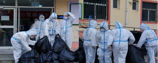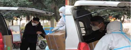 魏丰老师和几位志愿者在二号公寓楼接收防疫物资,并对物资进行检查、整理。