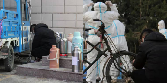 志愿者早餐结束,魏丰老师和青叶“大白”们陆续检查送水车辆、一号水房、二号水房的情况。期间,他要对借用的轮胎缺气车辆进行补气,确保送水运饭车辆正常运转,随后,还要去各楼宇检查水壶取放情况。
