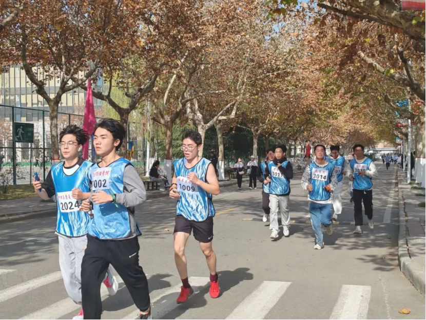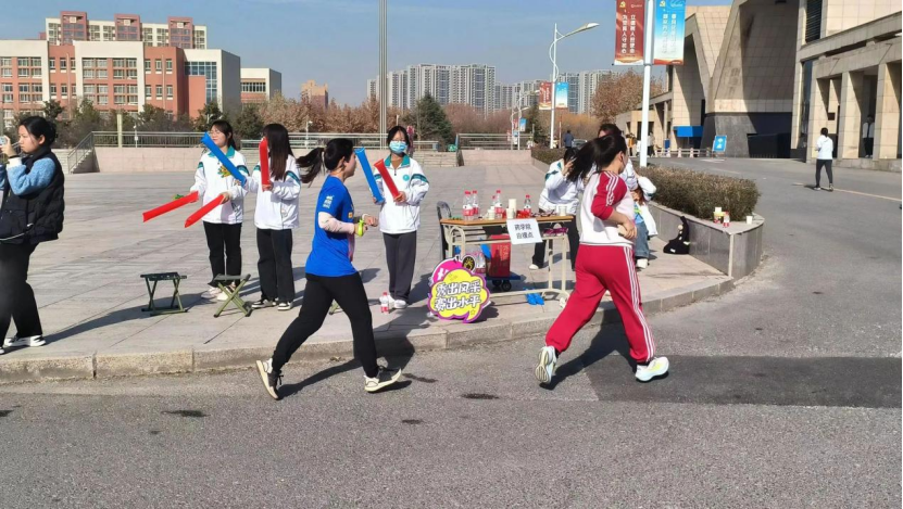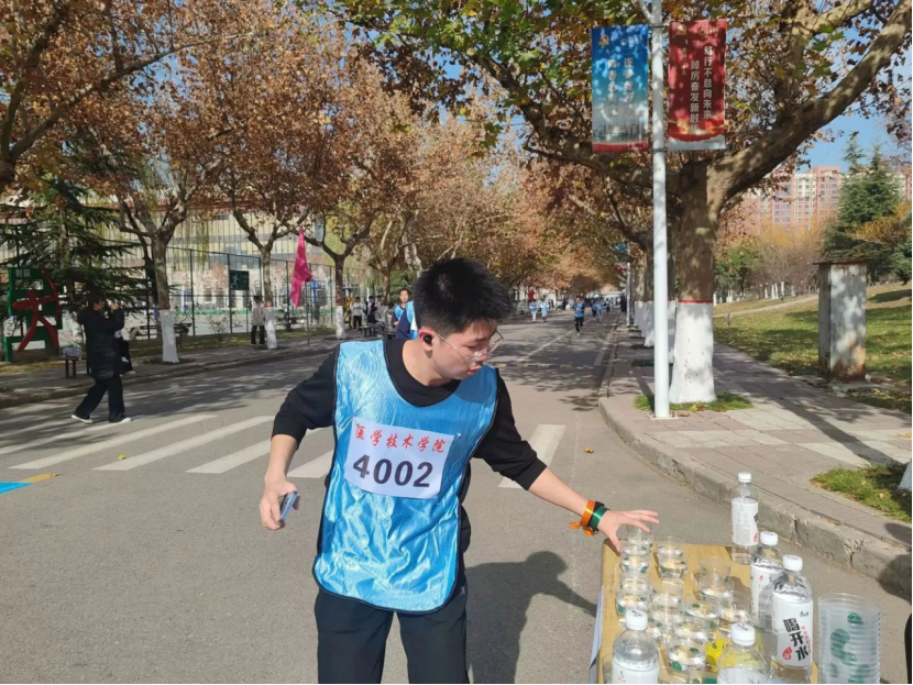 随着裁判发号枪的打响,第一队的参赛选手们沿着规划好的赛道从操场的西南门出发转向校园,在秋末冬初的季节里,展示着独属于青年人的活力。在赛道的沿途,各位志愿者在加油点早早倒好了水,准备好了各类补给,为各位运动员呐喊助威。