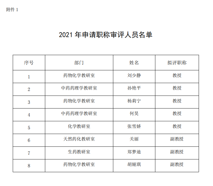 我院2021年申请职称评审材料分别通过了学校教务处、科技处、人事处及药学院教学科、党政办审核并盖章,通过的共有8名同志,具体名单见附件1(备注:人员名单按照姓氏笔画排序)。经由药学院职称工作领导小组审议通过,现予以公示,公示期3天。