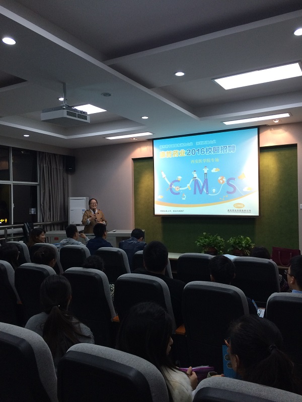 参加此次校园招聘会的有康哲药业的华中大区经理、产品经理和推广经理。招聘会首先播放了康哲药业的宣传片,随后推广经理向同学们介绍了康哲药业的公司概况及企业信仰,重点介绍了公司获得的福布斯相关奖项、公司股票市场及销售在医药行业中无穷潜力;与此同时产品经理分享了自己在公司这些年的成长经历,一番励志的言语激起了同学们的斗志,同时也燃起了同学们的希望。最后,华中大区经理对同学们最为关注的职业发展空间、薪资及福利待遇做了详细的解答。