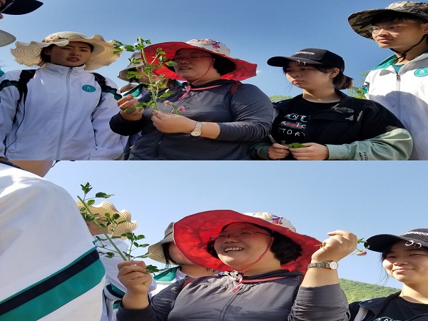 张彦老师作为第三组的带队老师,在药用植物地上部分的形态辨别特征方面,讲解细致,态度严谨。特别是在指导学生压制标本时总是一丝不苟。张老师在每味药用植物的药用价值与临床应用方面十分专业,因此同学们在野外实践的同时,总能获得很多中药的药用功效和临床实践应用方面的知识。