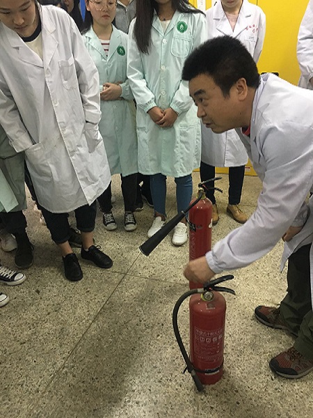 培训过程中,汪兴军老师就消防平常检查、消防火灾的应急和预防、消防器材的正确使用方法进行了深入浅出的讲解。特别强调了干粉灭火器和二氧化碳灭火器的正确使用方法。张彦老师倡导同学们增强“主人翁”意识,提高责任心。最后,张寒老师就实验室的防火安全、卫生保持和仪器维护等方面对本次培训做了总结。培训结束后,全体教师和学生对药学综合实验室(三)的药品和试剂的存放进行规整并且全面排查了用电安全。