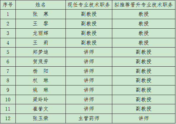 根据《西安医学院专业技术职务晋升评审条件暂行规定》(西医发〔2018〕38号)、《西安医学院专业技术职务评聘工作条例(试行)》(西医党发〔2018〕42号)、《西安医学院关于2020年职称评审工作的通知》(西医发〔2020〕104号),经西安医学院药学院、西安医学院第一附属医院初审,人事处复审,2020年11月19日药学院药学及管理学(医药市场营销)学科评议组评审,通过药学院职称工作领导小组审议,拟推荐以下12名教师晋升相应专业技术职务,并参加学校职称评审委员会审定,现予以公示(见下表),公示期3天。