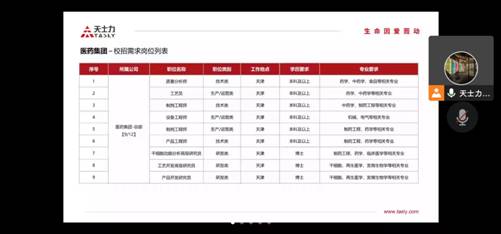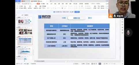 9月30日至11月10日,药学院邀请鲁南制药、幸福制药、晖致医药、恩华药业、神威药业、药明津石、康龙化成、上药科园、浙江我武生物、天士力、先声药业、金花企业、北京健次方、康哲药业、豪森药业、怡康医药、巨子生物、丽彩医药、麦科奥特、西安立迪生物、智飞生物、新绿色药业等22家行业知名医药公司进行空中宣讲,岗位涉及医药研发、QA、QC、CRC、基因检测、注册专员、合成研究员、学术专员等领域;同时不断收集并发布东科制药,天博检验、恒瑞医药、正大天晴药业、齐鲁制药等多家用人单位的招聘信息,提供岗位百余个。