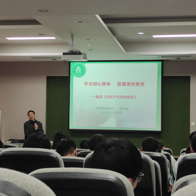 为扎实推进党史学习教育,学习贯彻党的十九届六中全会精神,落实党员发展工作,保证发展党员质量,药学院党总支学生党支部于11月17日-19日在立德楼三层党员活动室组织了为期三天的党史学习宣讲暨发展对象培训。药学院党总支正处级组织员吕忠田、学生支部书记李冰授课,全体学生党员及师生发展对象参加培训。