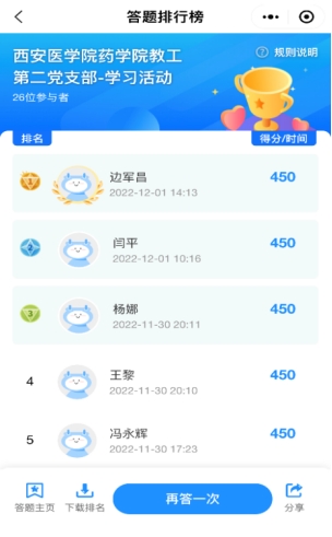 为深入学习宣传贯彻党的二十大精神,积极推进新时代师德师风建设,11月30日至12月2日,药学院教工党支部陆续开展“党的二十大精神学习暨师德师风建设”线上线下知识答题竞赛主题党日活动,全体党员教师参加学习竞答。